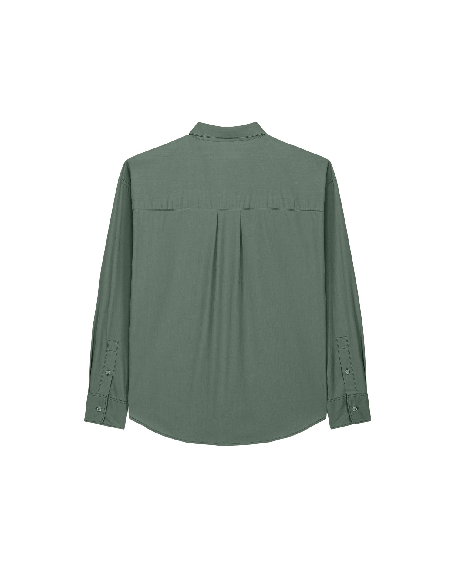 Shirt collar with collar stand Grown-on placket with single-needle topstitching on each side Forwarded shoulder seam with twin-needle topstitching Dropped shoulders Back yoke with twin-needle topstitching One-button sleeve placket One-button square cuffs Double pleats at cuffs Curved high-low hem with side vents